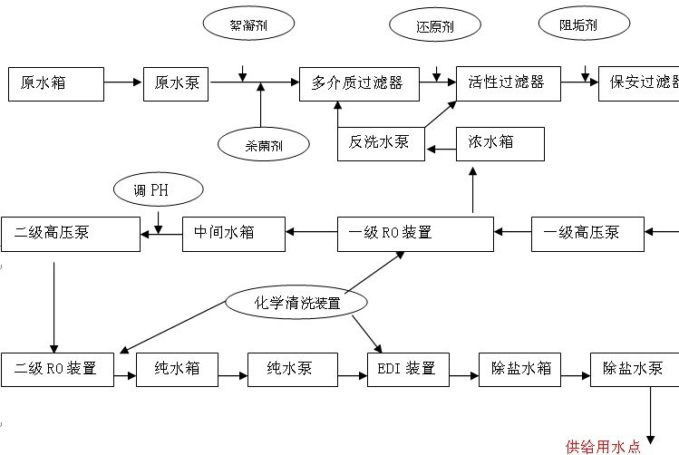 原水箱 → 增壓泵 → 砂濾器 → 碳濾器 → 軟水器 → 保安過濾器 ↓ EDI增壓泵 ← 二級純水箱 ← 二級RO主機 ← 一級純水箱 ← 一級RO主機 ↓ ↓ UV殺菌器 → 膜濾器 → EDI系統 →超純水箱 →超純水泵 ↓ 用水點 ← 終濾器 ← UV殺菌器 ← 拋光混床